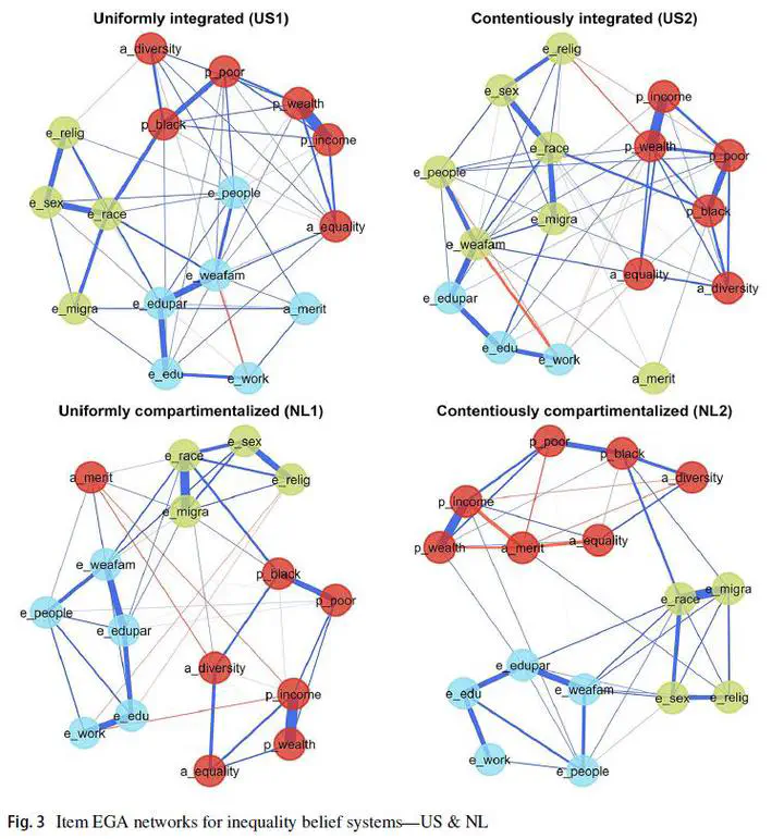 This paper purports to enrich the burgeoning field of research on the content of people’s beliefs about inequality by studying the structure of these beliefs. We develop a theoretical and methodological framework that combines Correlational Class Analysis and Exploratory Graph Analysis, and we test it empirically with original survey data collected in the United States and the Netherlands (n = 2,501 and 1,618). Using CCA, we identify groups of individuals who share construals of inequality, while EGA allows us to model these structures as inequality belief systems, which are networks of perceptions, explanations and attitudes about inequality. Results reveal the presence of two distinct belief systems in each country. These systems exhibit structural differences and are related to different sociodemographic factors in the U.S. and the Netherlands. Moreover, we show that inequality belief systems are more socially patterned in the former country. Finally, we demonstrate that belief systems, in both countries, are associated with different levels of support for redistribution. We discuss the significance of our findings for the politics of inequality and stress that overlooking attitudinal structures impedes a full understanding of people’s views on inequality and their support for redistribution.